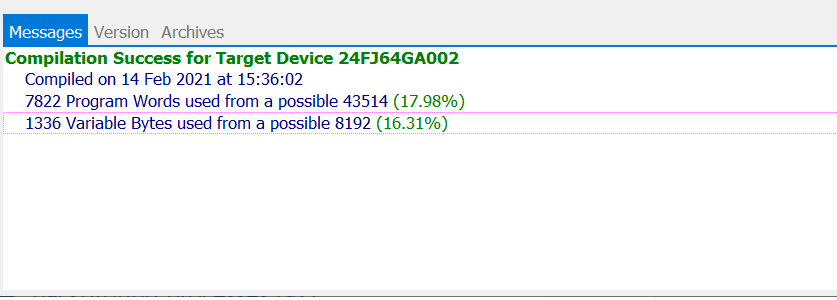 The Messages tab shows the results of the last compilation. A successful compilation will report the Code and Variable usage.