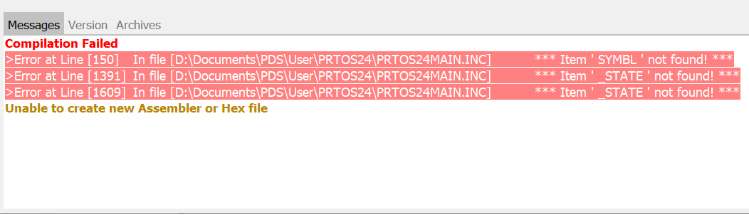 If the compilation fails for any reason the following the messages tab will report all the Errors and Hints encountered during compilation or assembly.