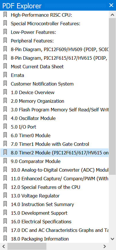 The PDF Explorer will only be accessible when the current page is a PDF page. The upper section of thePDF Explorer holds an outline view of the document in a tree structure, it will appear and behave much like the Adobe reader. You can expand or contract each node as required. Clicking on a node will move the document to the selected position. Search is provided in the PDF page. |