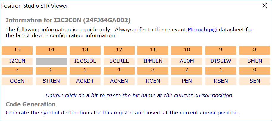 If the Bit Name file is available for the current device clicking on the link at the bottom of the dialog will insert the Symbol declarations for that register into the page at the current cursor position. Alternatively, you can add individual symbol declarations as and when those bit names are used.